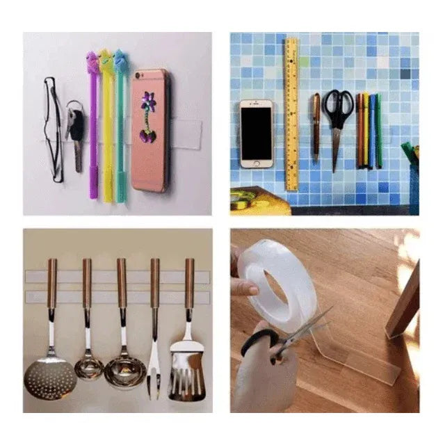 Soporta hasta 1 kg por cada 10 cm de cinta correctamente aplicada. Es ideal para fijar cuadros, marcos, alfombras, utensilios, cables, organizadores y objetos livianos en la cocina, el auto o cualquier parte del hogar.