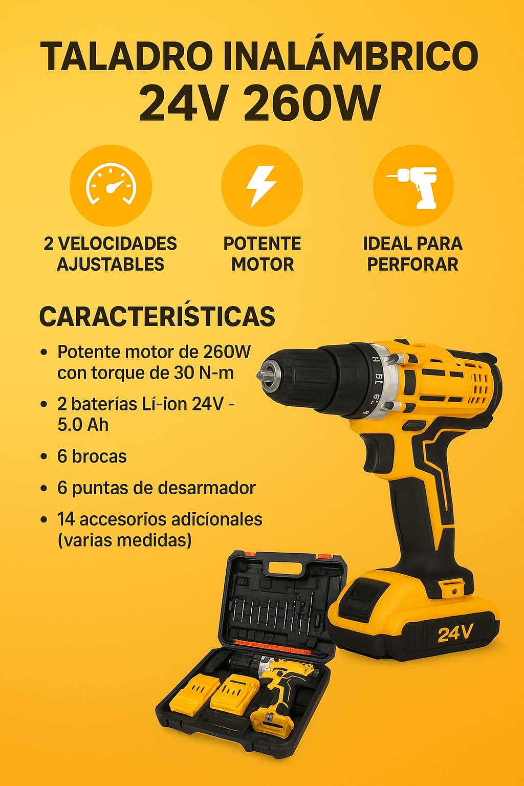 Incluye taladro, 2 baterías, cargador rápido y 26 accesorios dentro del estuche.